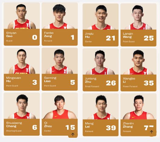 中国男篮世预赛首场比赛阵容:周琦、曾凡博、张镇麟、王岚嵚、高诗岩、胡明轩、廖三宁、程帅澎、胡金秋、朱俊龙、李祥波、雷蒙。